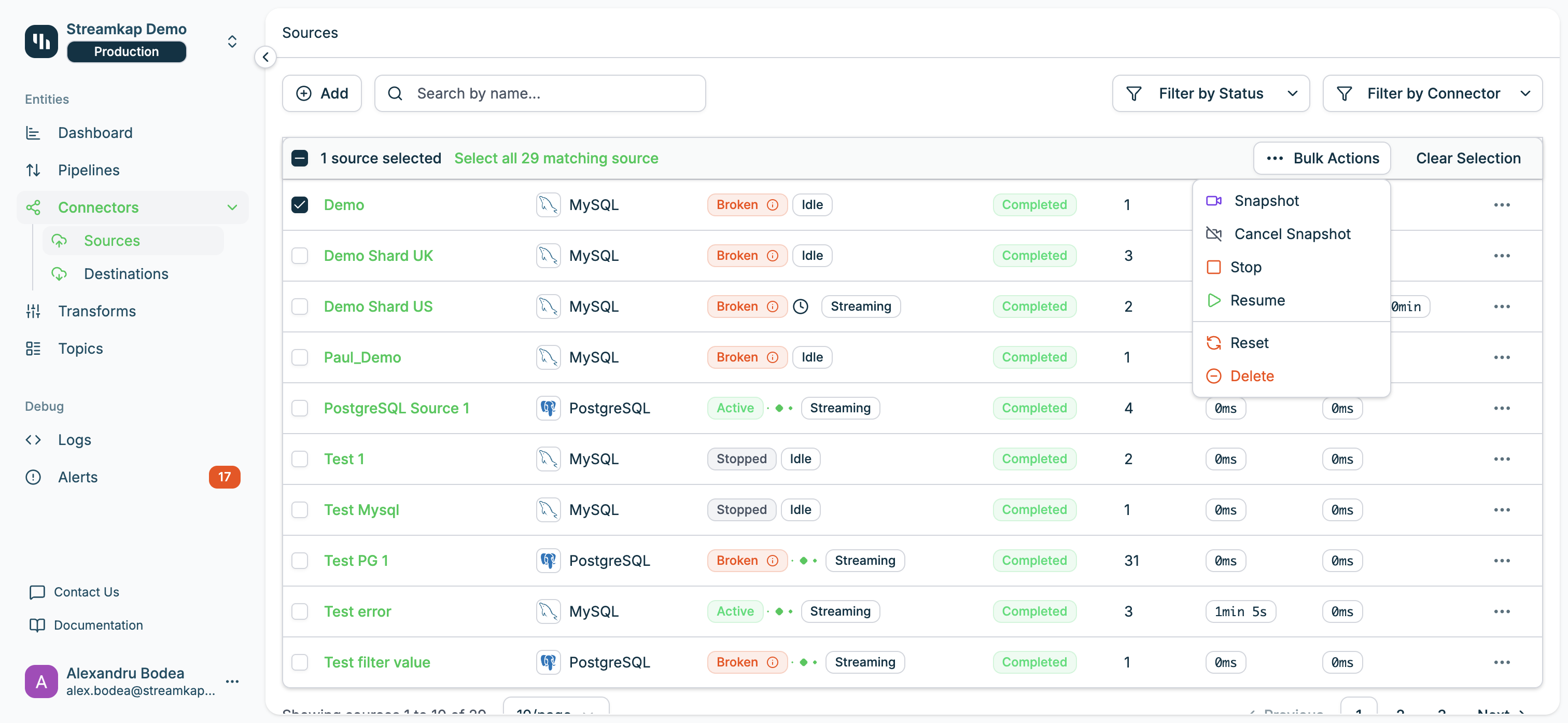 - Cancel Snapshot: Cancel ongoing snapshots for all selected sources