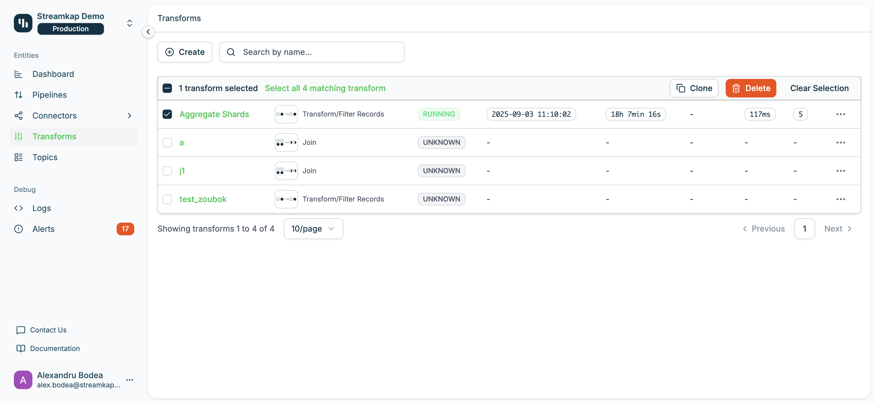 Select multiple transforms using the checkboxes on the left side of the table to perform actions on multiple transforms at once. When transforms are selected, the bulk actions bar appears at the top of the table.
